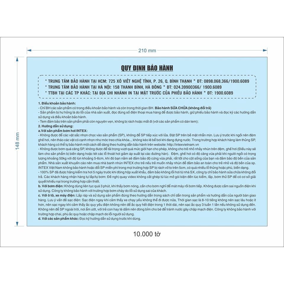 - Bảo lãnh thương hiệu: Công ty TNHH SPBH Intex Việt Nam