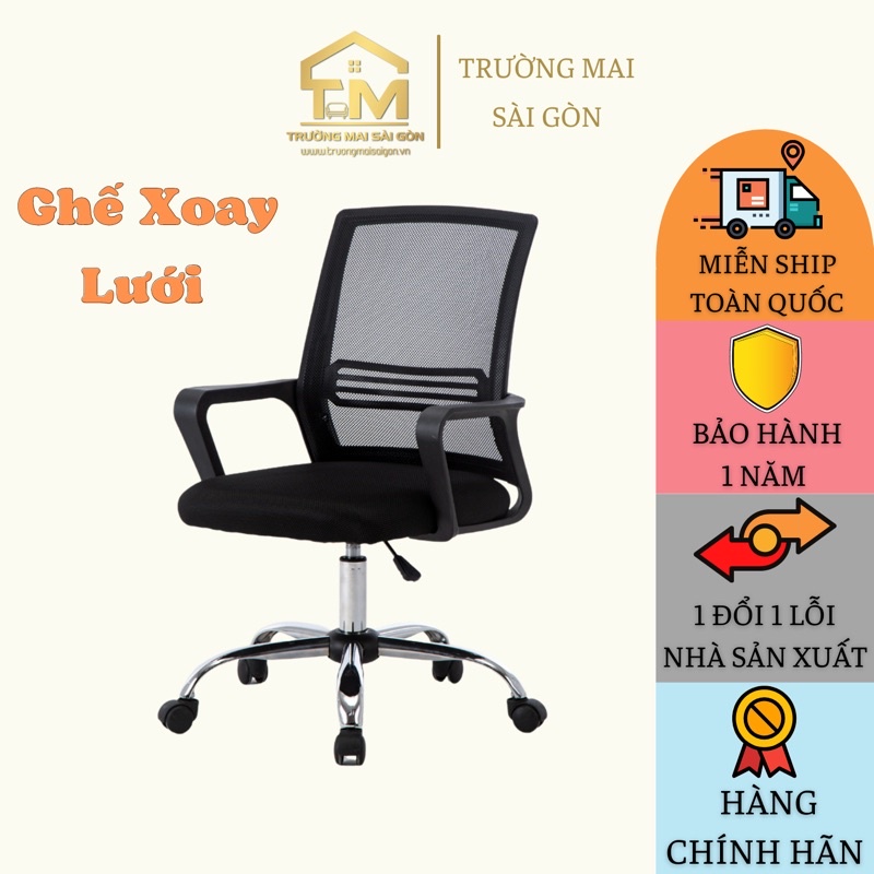GHẾ XOAY LƯỚI_GHẾ XOAY VĂN PHÒNG TRƯỜNG MAI SÀI GÒNGhế làm việc văn phòng chân xoay 360 độ Trường Mai Sài Gòn lưng lưới thoáng mát chân mạ crom kết hợp piton cao cấp