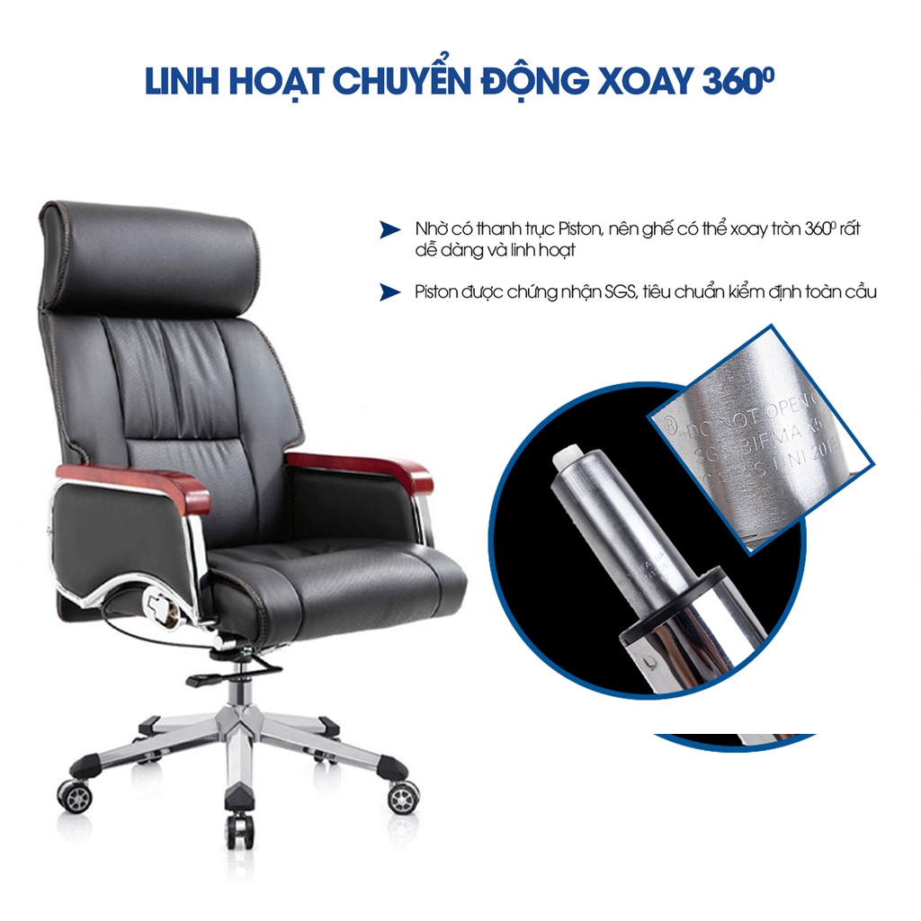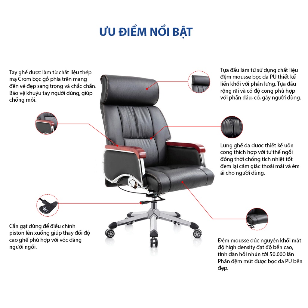 + Chân ghế được thiết kế mạ crom cao cấp, khung chân đa giác thiết kế độc quyền, bền, chắc, chịu tải lên tới 2000kg.