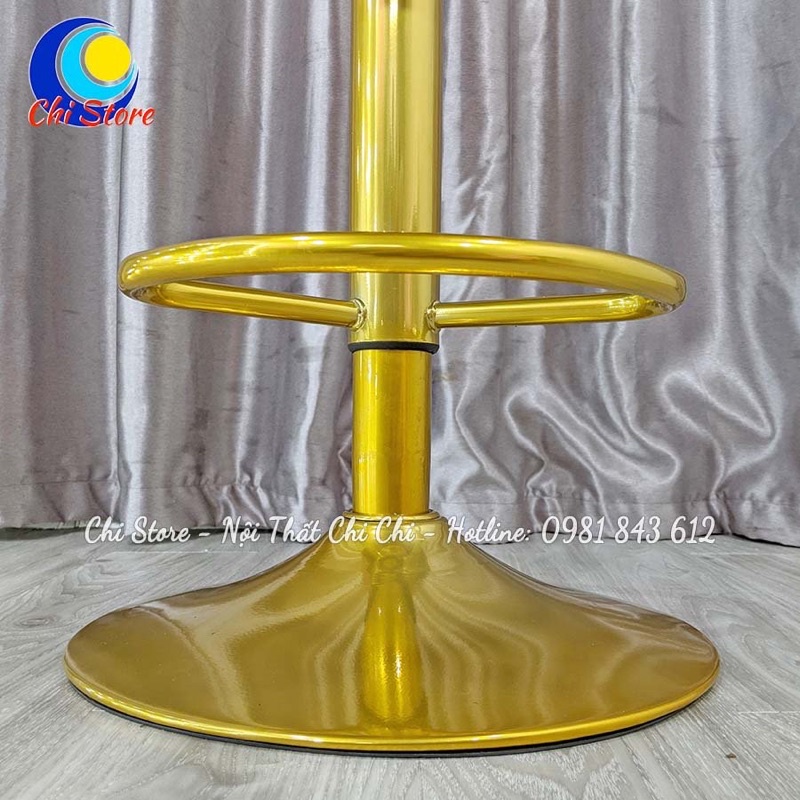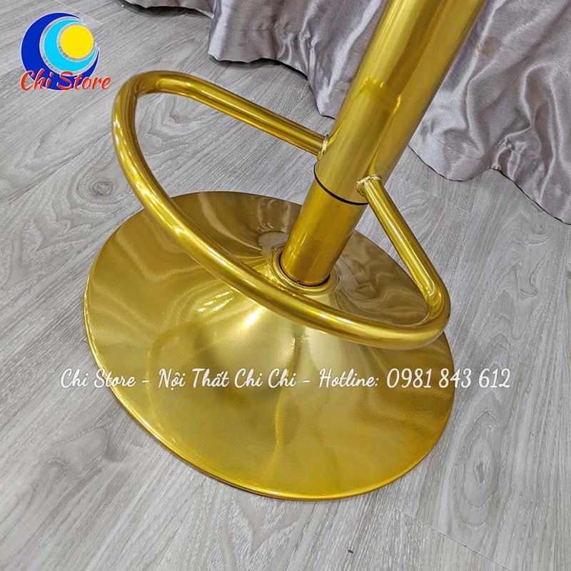 ⚜Chân của ghế make được làm bằng inox mạ vàng tĩnh điện 304 sáng bóng siêu sang và chắc chắn. Có cần gạt để điều chỉnh độ cao từ 60cm tới 80cm và xoay 360 độ.