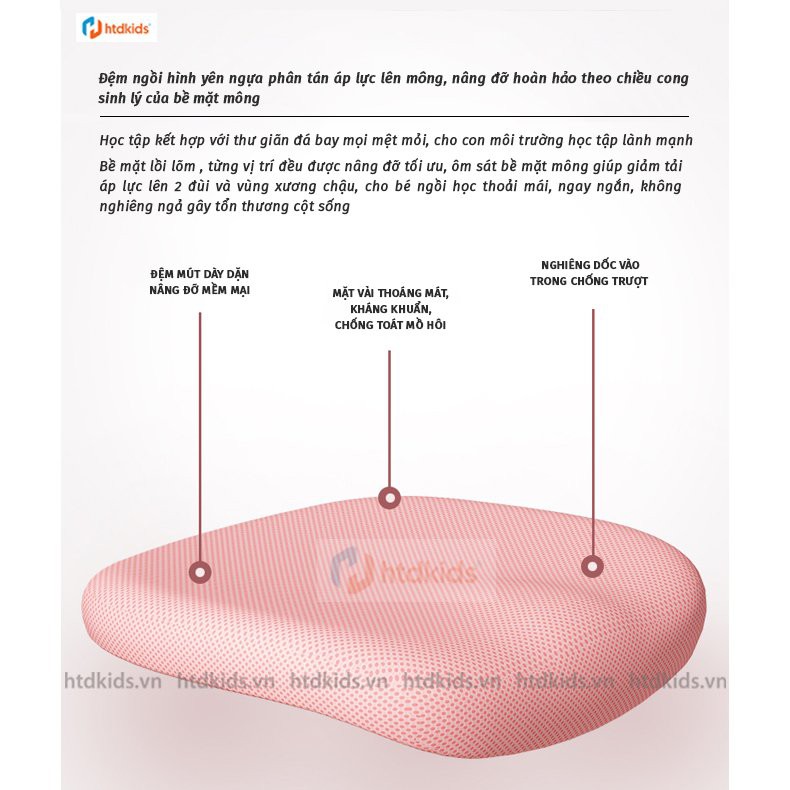 ✔️ Bề mặt lồi lõm, từng vị trí đều được nâng đỡ tối ưu, ôm sát bề mặt mông giúp giảm tải áp lực lên 2 đùi và vùng xương chậu, cho bé ngồi học thoải mái, ngay ngắn, không nghiêng ngả gây tổn thương cột sống.