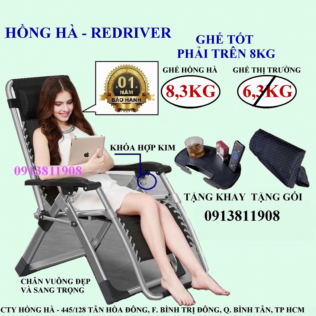Có khóa bằng hợp kim, Ghế thư giãn Hồng Hà là ghế nhập khẩu Cao Cấp nặng trên 8,3 Kg không cân bao bì , tức dày hơn sản phẩm cùng loại trên thị trường trên 1,3 KG. Ghế thị trường hiện nay nếu không cân luôn thùng thường dưới 7Kg, có loại còn dưới 6Kg, rất mỏng manh,dùng không bao lâu gãy khung và rách vải lưới.Ghế Hồng Hà bảo hành 1 năm, Tặng kèm gối và khay cafe, Miễn phí vận chuyển TP Hồ Chí Minh, tỉnh xa hổ trợ giãm đến 70.000 cước phí, khách hàng miền trung và miền bắc liên hệ shop để được giãm thêm cước , Mr Minh 0913811908.