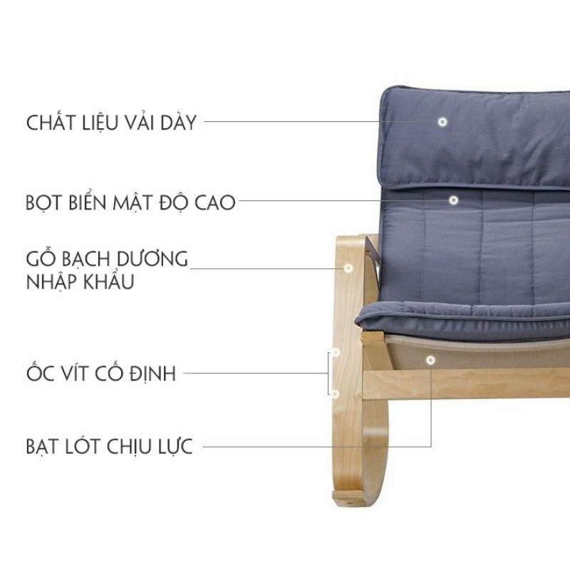 Chất liệu: khung ghế từ gỗ bạch dương cực dẻo dai, chịu lực cao, đệm mút, vỏ đệm làm bằng vải kaki cao cấp đem đến sự thoải mái, vải chống bụi và chống thấm nước.