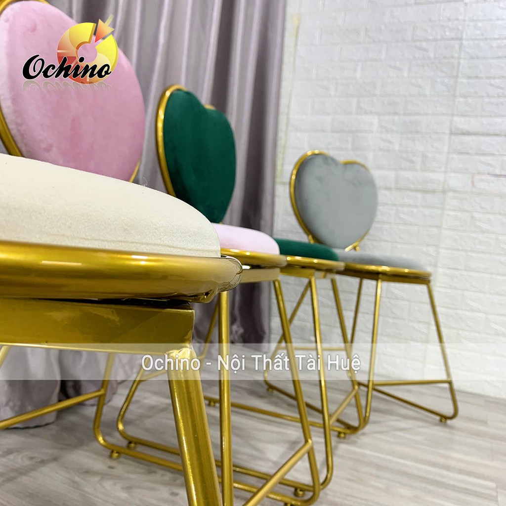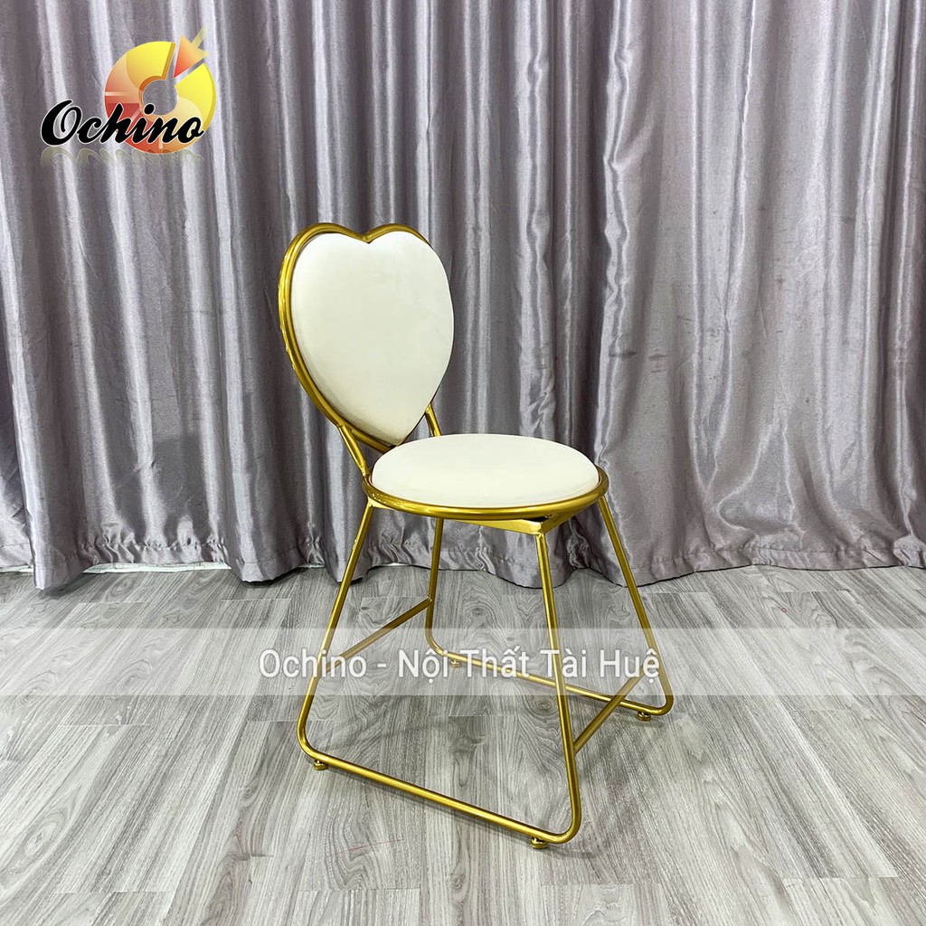 ⚜️Khung ghế trang điểm được làm từ kim loại sơn tĩnh điện bóng uốn lượn màu vàng gold chống han rỉ chắn chắn và cực kì bền theo thời gian nha. Dưới chân ghế trang điểm tim có lớp lót đế chống xước sàn nha.