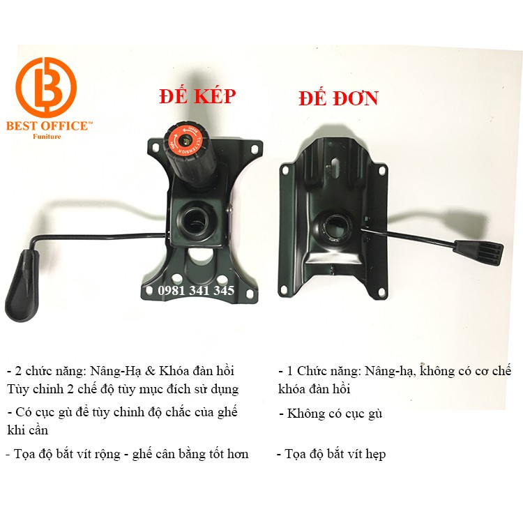 - Đế ghế là Đế kép, Full 2 chức năng: Nâng-Hạ & Khóa đàn hồi (Đế đơn không có khóa)