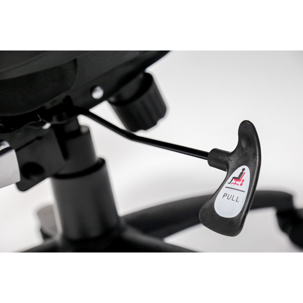 Trụ dưới ghế có thể điều chỉnh độ cao bằng cần gạt ở bên phải, chân đế dạng hình sao 5 bánh với các bánh di chuyển rất trơn tru.