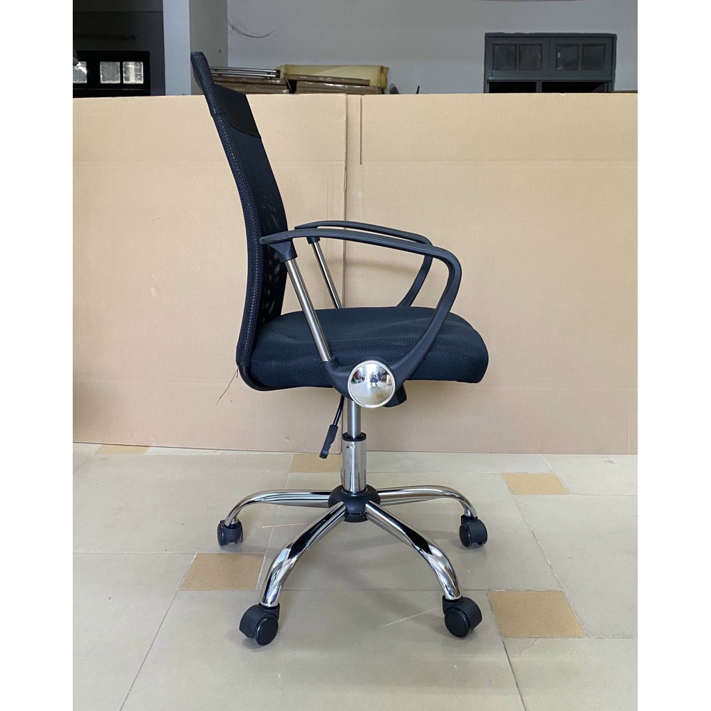 Ghế văn phòng hiện đại. Mẫu ghế xoay văn phòng hiện đại với mặt lưng tựa dạng lưới giúp thông thoáng và thoát khí tối đa. Ghế có cấn trục tăng giảm chiều cao mặt ghế cho phù hợp với chiều cao mặt bàn. Bạn có thể sử dung mẫu ghế này làm ghế nhân viên văn phòng, ghế làm việc tại nhà…Chân ghế được làm bằng thép xi mạ chrome sáng bóng sang trọng. Hệ thống bánh xe bằng nhựa đúc chắn chắn giúp bạn di chuyển dễ dàng. Một điểm nhấn ấn tượng và là mặt của mẫu ghế văn phòng này chính là phần tay vịn của ghế.