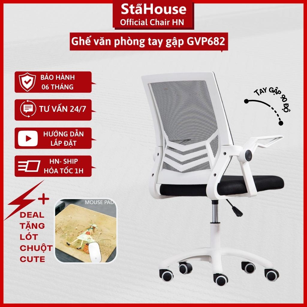 Ghế văn phòng tay gập thông minh GVP682, lưng lưới thoáng mát, chân xoay bọc nhựa chống gỉ, đệm êm, thay đổi cao thấp dễ
