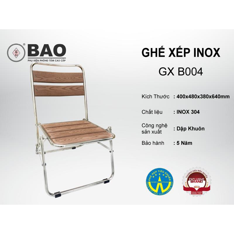 Ghế xếp BAO Inox GXB004 trắng bạc phối vân giả gỗ composite, sản xuất bởi công nghệ dập khuôn, được làm bằng chất liệu Inox 304 chất lượng cao không tạp chất, chống ăn mòn cao, không gỉ sét, sáng bóng, mẫu mã đẹp, có thể chịu được lực va đập lớn. Mặt ngồi được làm bằng nhựa composite có vân giả gỗ cao cấp, độ bền cao, có thể chịu được lực lớn, thời hạn bảo hành 05 năm.