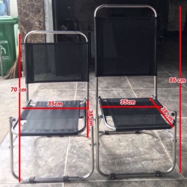 Ghế xếp có 2 loại : lưng cao ( chiều cao ghế 85 cm ngang phủ bì 38cm ) và lưng thấp( chiều cao ghế 67 cm ngang phủ bì 38cm )- Inox 201, dày 1 ly. Chịu lực trên 110 kg