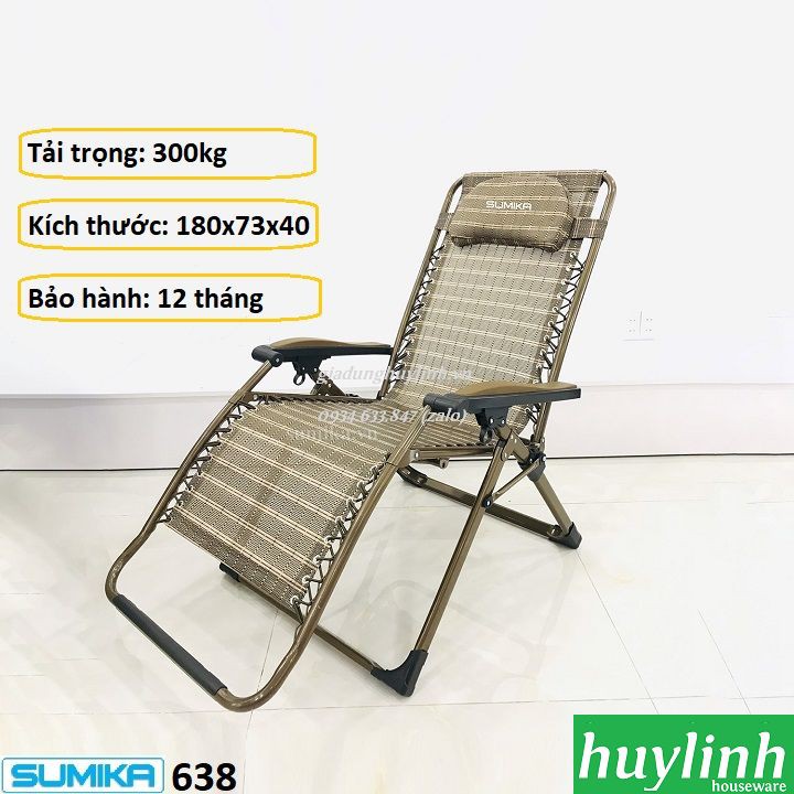 Ghế xếp thư giãn Sumika 638 là dòng sản phẩm mới tới từ thương hiệu Sumika với tải trọng lên tới 300kg, kích thước được cải thiện với bề rộng tới 73cm.Huy Linh phân phối và bảo hành chính hãng tại Sumika Việt Nam