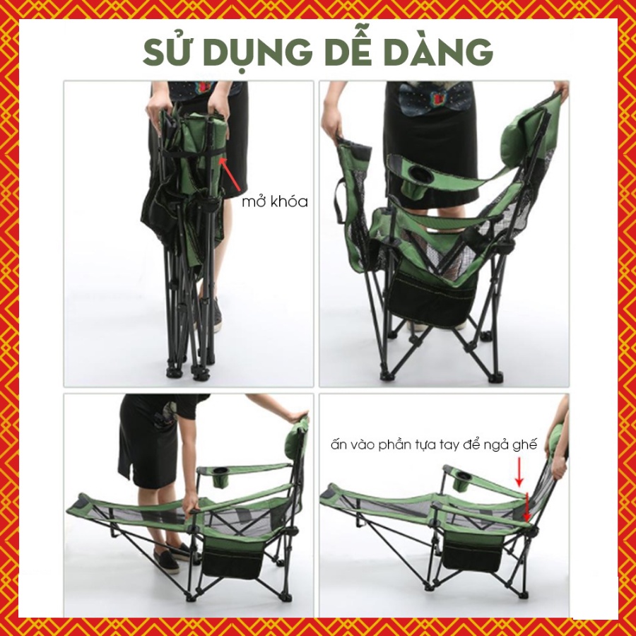 - Ghế xếp thư giãn có gối, ngăn đựng sách báo, điện thoại, hốc để ly, chai nước.