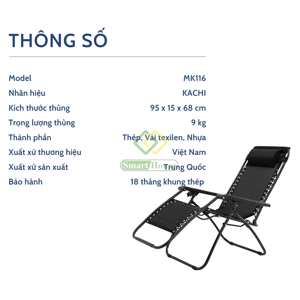 - Ghế xếp thư giãn Kachi MK116 có thiết kế thông minh để có thể vừa là chiếc ghế ngồi vừa làm giường nằm thoải mái.