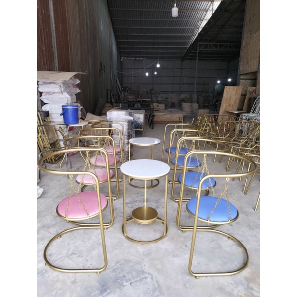 Khung ghế làm bằng sắt sơn tĩnh điện chống gỉ màu vàng đồng , mang phong cách hiện đại và trẻ trungCó nệm bọc ngồi tạo cảm giác êm ái khi đu đưa