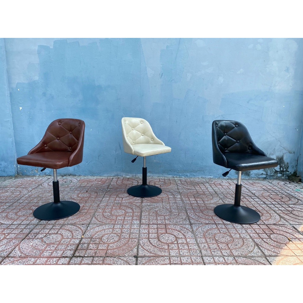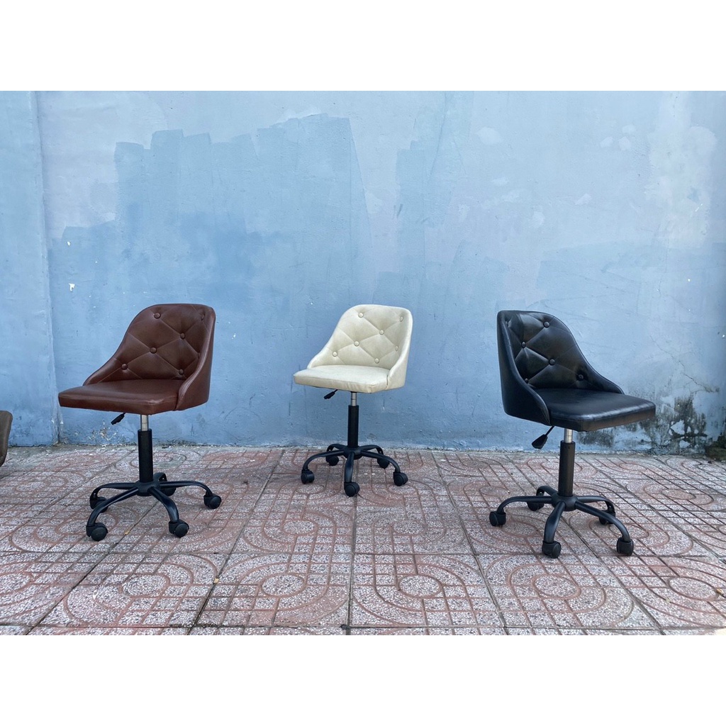 Ghế làm việc nhỏ gọn. Một mẫu ghế chân xoay có kích thước khá nhỏ gọn phù hợp cho những không gian có diện tích khiêm tốn. Ghế phù hợp trong không gian nội thất gia đình, văn phòng. Bạn có thể sử dụng chúng như là ghế ngồi làm việc, ghế bàn học, hay ghế cho nhân viên văn phòng…Mẫu ghế làm việc này gồm các thành phần cấu tạo chình là mặt ghế, chân ghế, cần và trục tăng giảm chiều cao ghế, bánh xe. Phần chân ghế, trục tăng được làm bằng thép mạ vàng sáng bóng hoặc sắt sơn tĩnh điện, bánh xe chân ghế bằng nhựa đúc màu đen. Giữa mặt ghế và chân ghế là mâm liên kết với 4 ốc vít rất dễ tháo rời và lắp đặt. Mặt ghế được làm bằng da PU sáp dầu, chân ghế sắt sơn đen