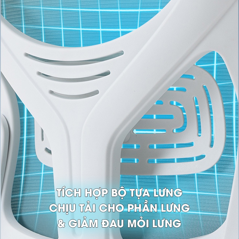 - Tựa lưng vải lưới thoáng khí và được thiết kế có giá đỡ lưng đặc biệt giúp nâng đỡ phần ngang thắt lưng công thái học giúp thư giãn trong quá trình ngồi làm việc thời gian dài