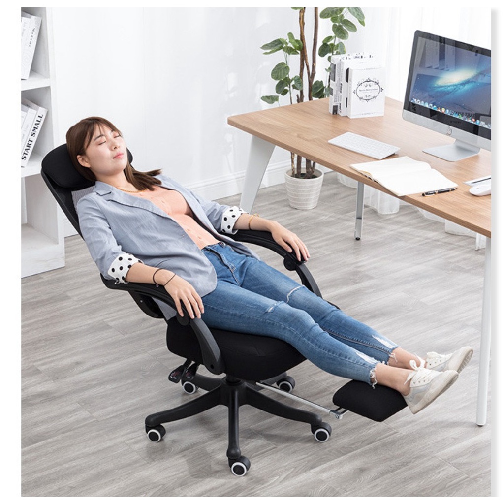 Ghế xoay văn phòng ngả nằm có gác chân mẫu ghế hiện đại phù hợp cho văn phòng hay làm việc tại nhà hoặc gaming đều rất thoải mái với chất liệu khung nhựa PP cao cấp chân thép xi mạ xoay 360 độ với nệm ngồi êm ái, hệ lưng lưới thoáng mát và gác chân bằng vải lưới êm ái, ghê có thể ngả nằm góc rộng tựa đầu cao thoải mái và đặc biệt tay chuyển động theo hướng nằm nền gác tay rất êm.Có thể chọn loại không gác chân