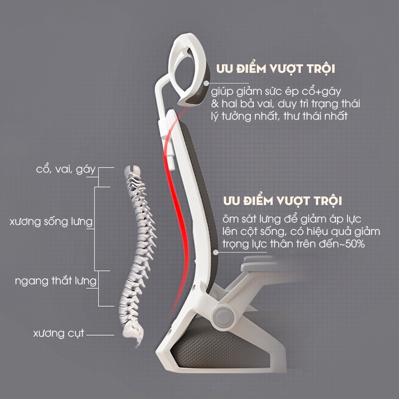 - Dễ dàng thay đổi chiều cao ghế, thay đổi chiều cao, góc nghiêng gối tựa đầu