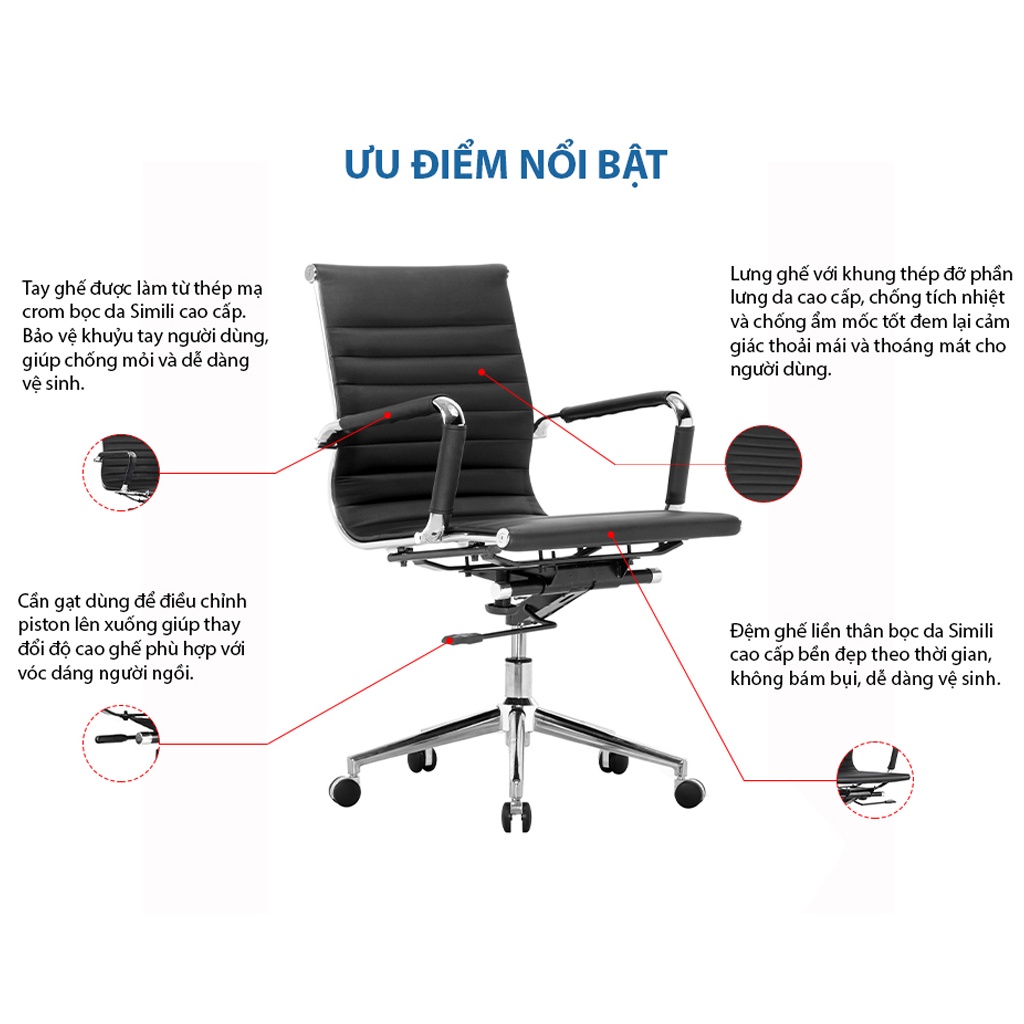 Thiết kế đạt tiêu chuẩn Ergonomic – bảo vệ sức khỏe người dùng, hạn chế mắc các bệnh văn phòng. Ghế xoay lưng da tạo cả giác êm ái, thoải mái cho người ngồi, giúp nâng cao năng suất công việc.