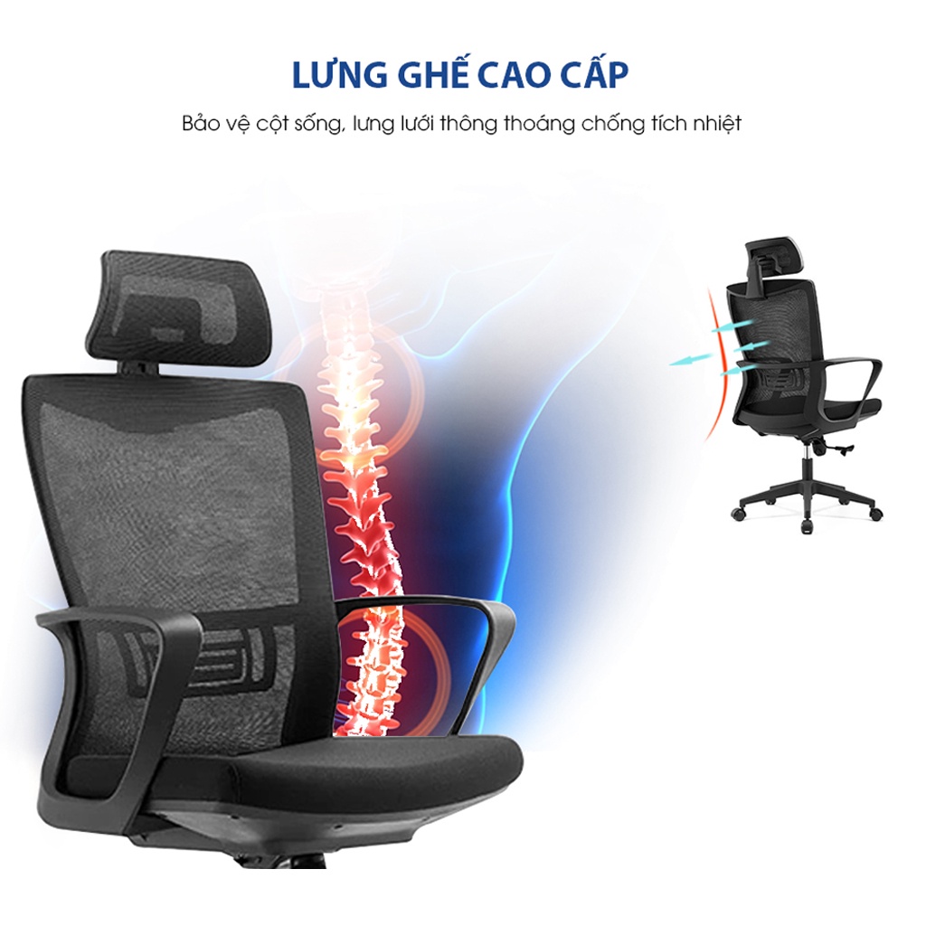 + Khung lưng bằng nhựa nylon PA. Tựa lưng bọc vải lưới cao cấp. Đệm đỡ lưng điều chỉnh độ cao thấp, ôm sát lưng người ngồi.