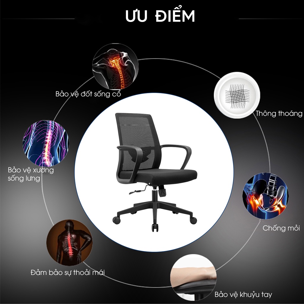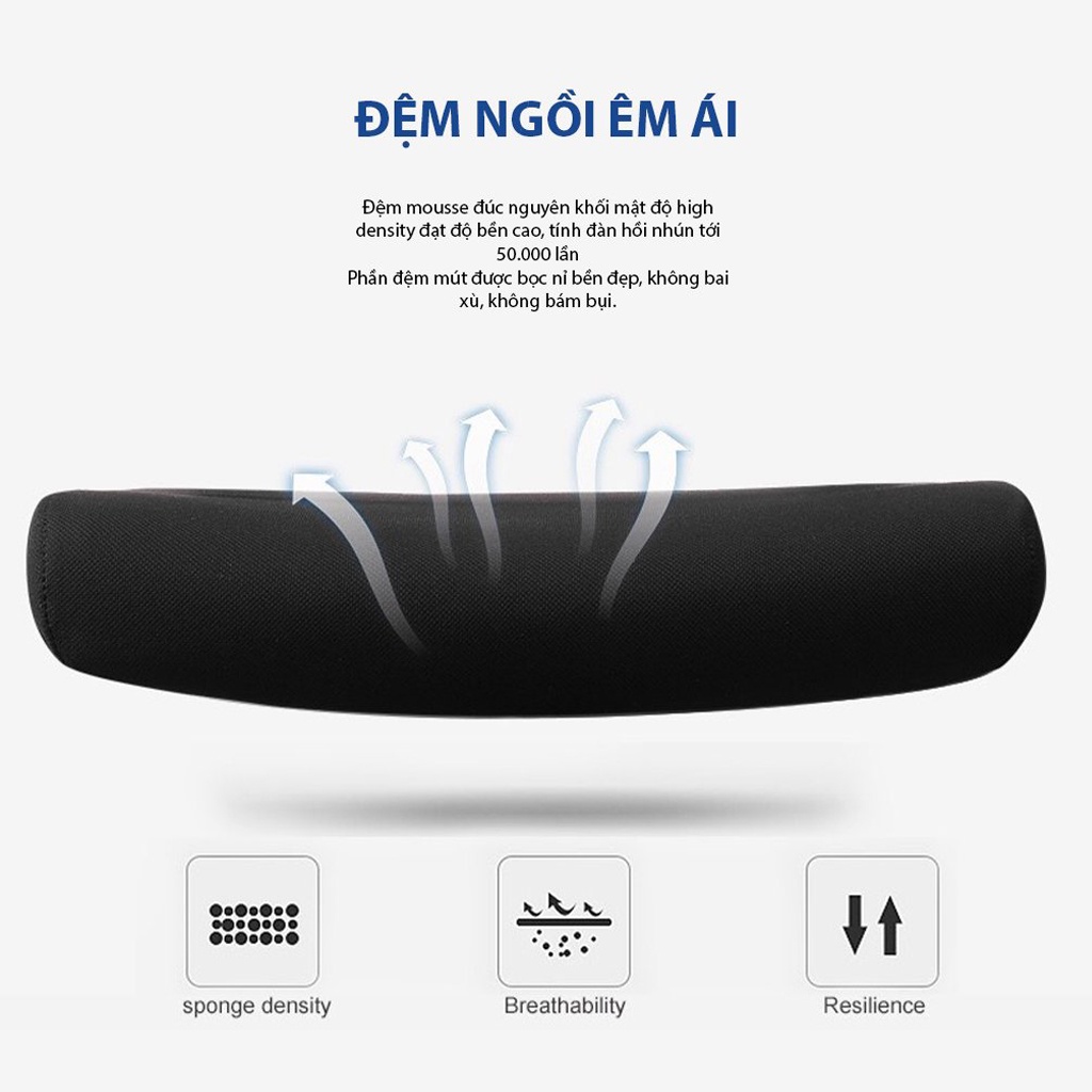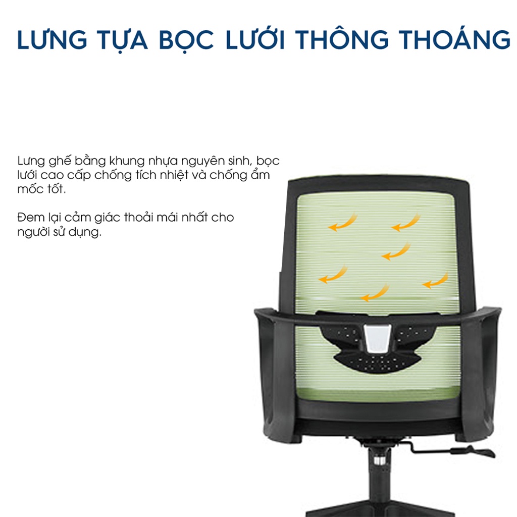 + Khung lưng bằng nhựa nylon PA. Tựa lưng bọc vải lưới cao cấp. Đệm đỡ lưng cố định, ôm sát lưng người ngồi.
