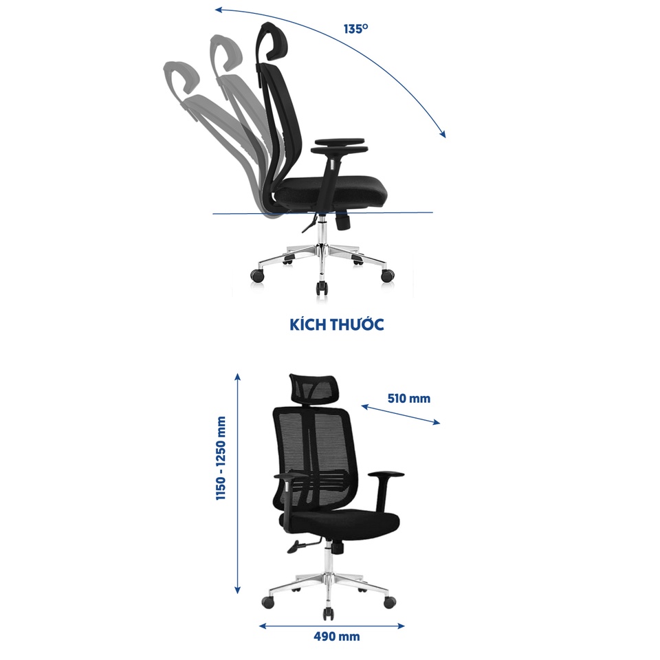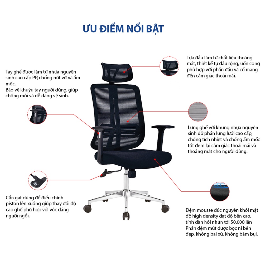 + Piston điều chỉnh độ cao thấp của ghế, đạt tiêu chuẩn BIFMA của Mỹ.