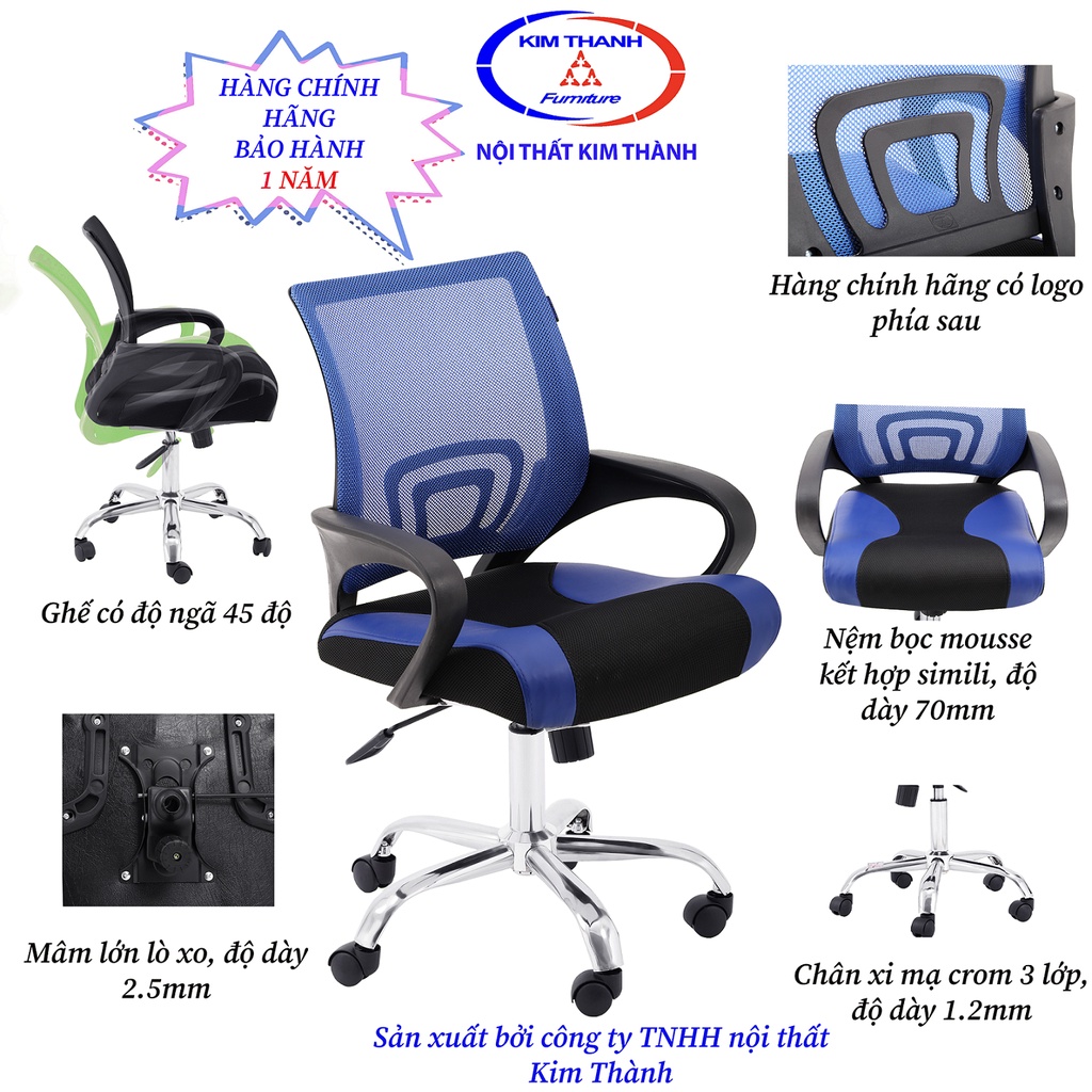 Chất liệu bền bỉ, chắc chắnGhế nhân viên lưng lưới, chân xi mạ, ben hơi mạ crom có khung ghế bằng kim loại cứng cáp, bền đẹp. Đệm ngồi bọc vải có độ mềm và đàn hồi vừa phải, mang đến cảm giác êm ái, thoải mái khi ngồi. Lưng ghế bằng lưới thoáng mát, hơi uốn cong giúp giữ vai và dáng người ngồi được thẳng. Nhờ vậy, ghế giúp hỗ trợ cột sống vùng thắt lưng, bảo vệ sức khỏe, giảm thiểu tối đa các triệu chứng nhức mỏi trong môi trường làm việc lâu dài, đồng thời tăng thêm tính thẩm mỹ cho sản phẩm.