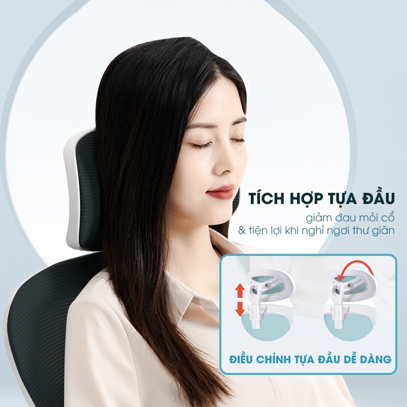 - Có phần tựa đầu và có thể điều chỉnh tựa đầu thoải mái, ghế có thể ngả ra sau và nâng cao hoặc hạ thấp tùy chỉnh