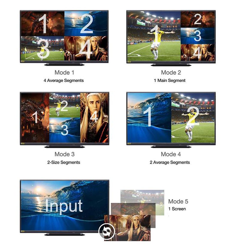 BỘ GHÉP 4 MÀN HÌNH này có thể chia được nhiều dạng hiển thị cùng lúc như hình minh họa. Có remote điều khiển cực tiện lợi