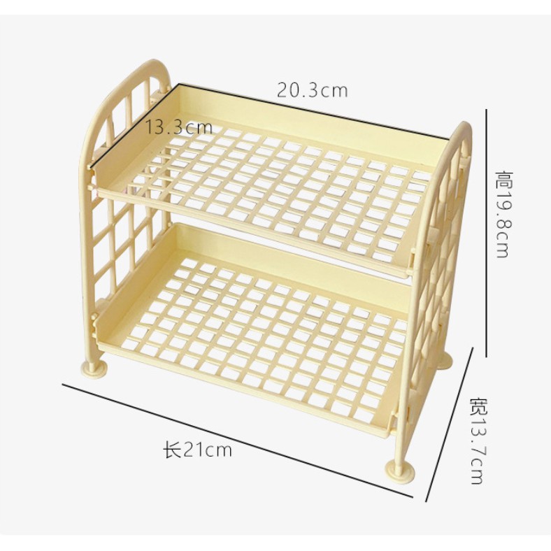 - Kích thước: kệ gồm 2 tầng, chiều ngang 21cm, rộng 13.7cm và cao 19.8cm