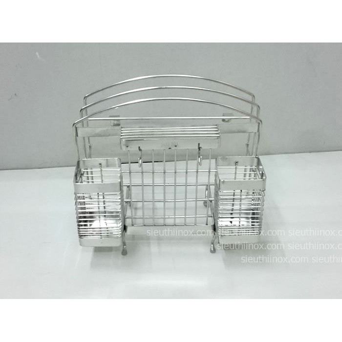 Giá cài dao thớt đôi có kèm ống đũa, chất liệu inox 304, các mối hàn mịn, không sắc tay. Inox tròn đặc cứng cáp.Kèm giỏ đủa, móc treo muôi, kéo