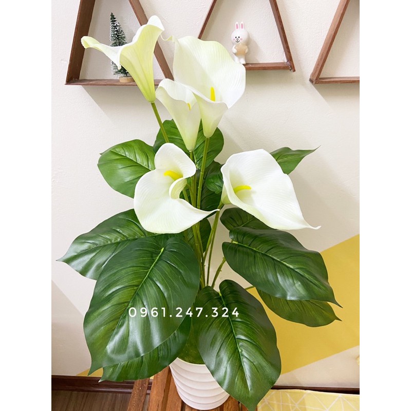1 cây gồm có 5 bông chất liệu hoa cao su + 13 lá to + cành lõi thép chắc chắn, có thể uốn tạo hình dễ dàng
