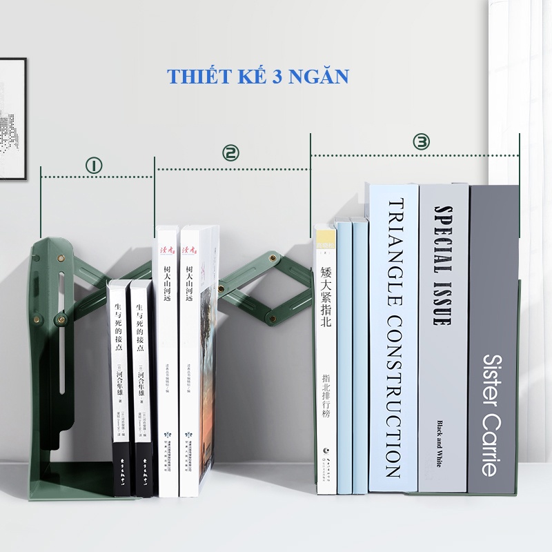+ Giá chặn sách bao gồm 3 ngăn có độ ổn định hoàn hảo và không bị nghiêng ngay cả khi đặt sách ở một ngăn bất kì.