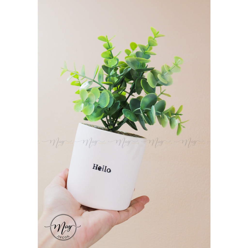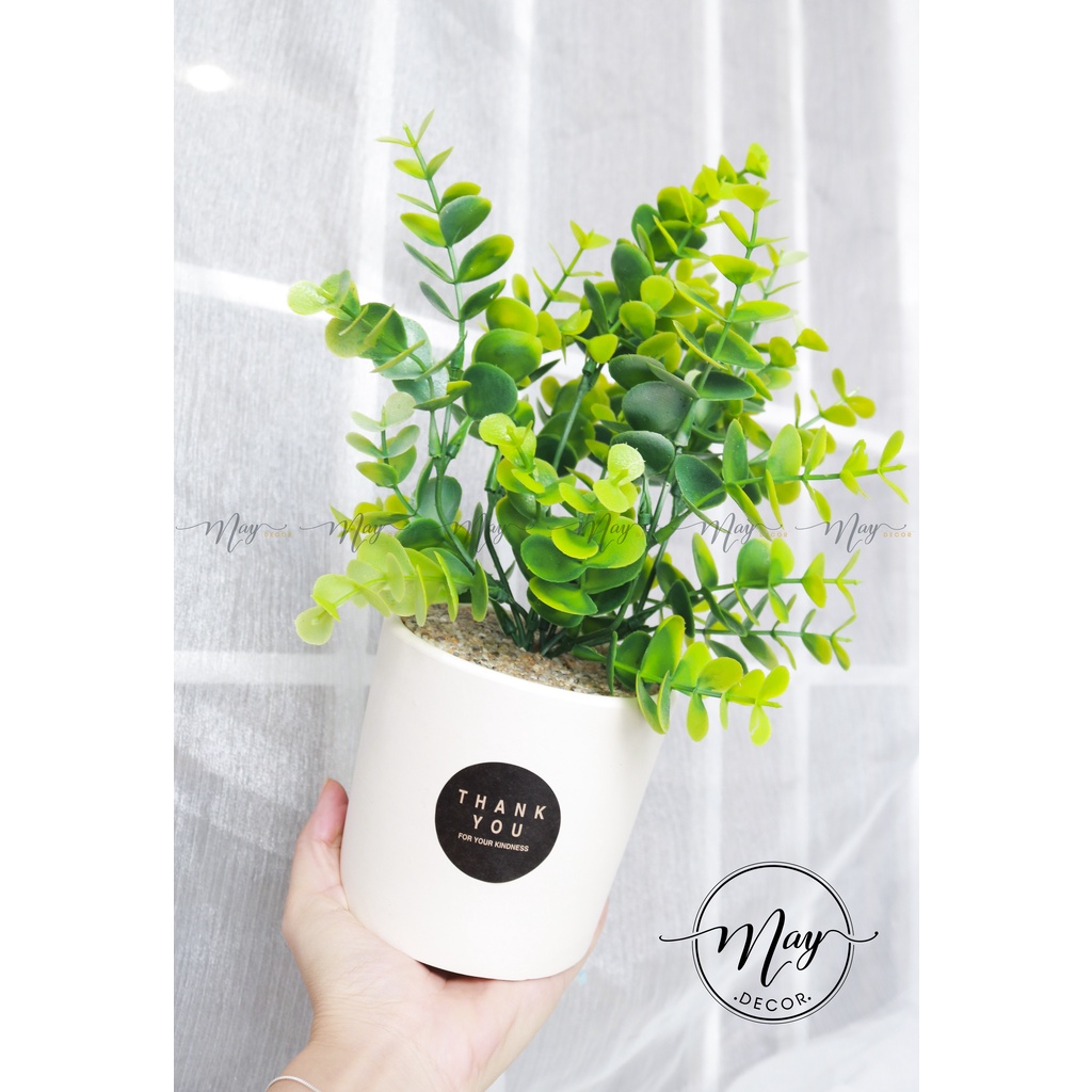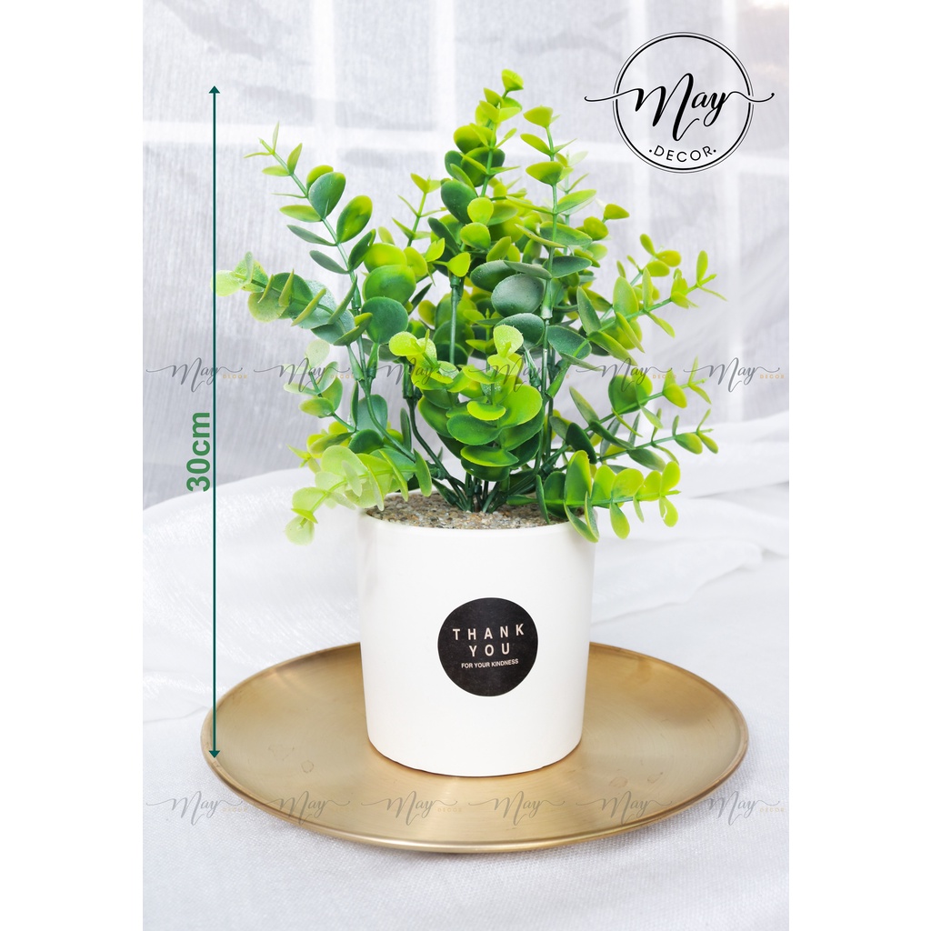 Cây giả, Chậu cây Khuynh Diệp chậu đất nung trắng 30, 22cm