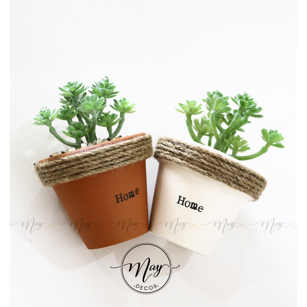 Chậu đất nung in chữ thủ công và quấn cói trang trí