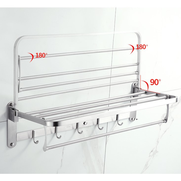 Kệ treo khăn thiết kế đa năng, tầng trên để đặt khăn tắm khi xếp thành cuộn; có 1 thanh ngang để vắt khăn tắm cho khô; bên dưới thiết kế thanh móc treo đồ với 5 móc trụ đặc. 5 móc trụ đặc uốn cong lên để giữ quần áo móc vào dễ dàng mà không tuột rơi xuống, phần đỉnh móc được mài nhẵn trơn tru, nên không gây ra rách quần áo khi móc lên.