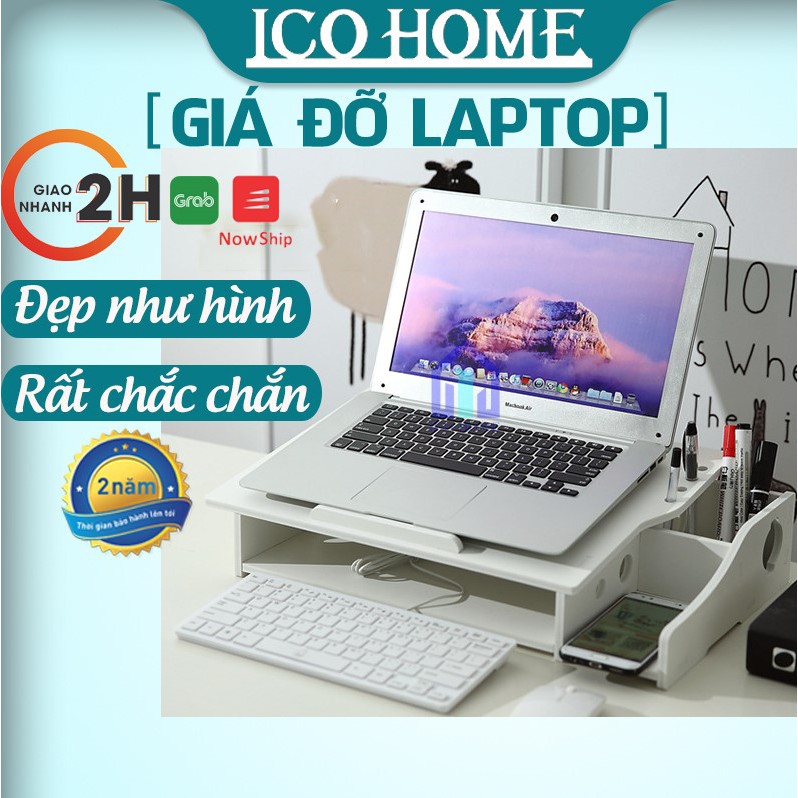 Giá để máy tính laptop bằng gỗ để bàn có khay đựng bút, đế tản nhiệt - Ico Home