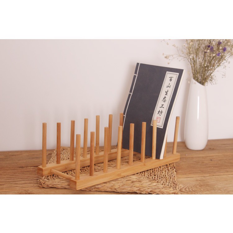 Chất liệu: làm từ tre và được xử lý kỹ thuật giúp giá gỗ có tính kháng khuẩn cao, dễ lau chùi, không dễ bị nấm mốc. không nứt, không biến dạng.+ Kích thước: 25.5*11.5*10cm (D-R-C): gồm 8 thanh dọc, dành cho khách nhu cầu sử dụng ít, úp cốc hoặc sách decor nhà cửa