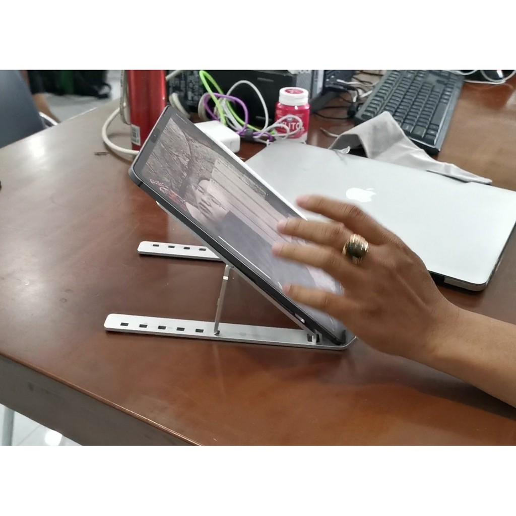 Giá đỡ laptop macbook, máy tính bảng ipad bằng nhôm + có thể xếp gọn + điều chỉnh độ cao.Tặng kèm bao đựng tiện lợi.