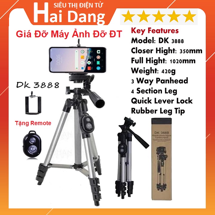 Điện Thoại & Phụ Kiện > Phụ kiện > Phụ kiện selfie > Giá đỡ || Giá Đỡ Ba Chân DK-3888, Tặng Remote Kết Nối Bluetooth - Dùng Cho Máy Ảnh Và ĐT - Tripod Bằng Nhôm 1M - Bảo Hành 6 ThángCòn hàng