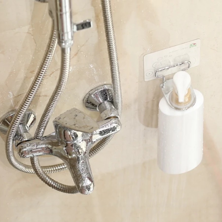 Lau sạch bề mặt cần dán, bóc miếng bảo vệ keo dán, dán và dùng khăn mềm miết vòng tròn từ trong ra ngoài. Cài từng bên cố định giá kim loại vào móc theo hình hướng dẫn. Vặn mở nắp chai sữa tắm, ghép đệm nhựa giữ cổ chai vào giá, vặn chặt nắp chai để cố định.