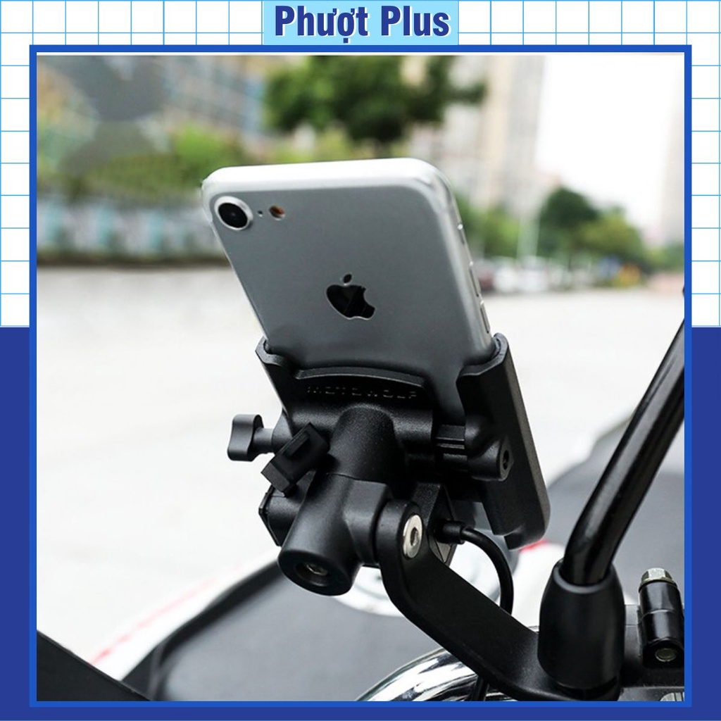 Giá đỡ điện thoại có sạc gắn chân gương, ghi đông xe máy Motowolf Chính Hãng