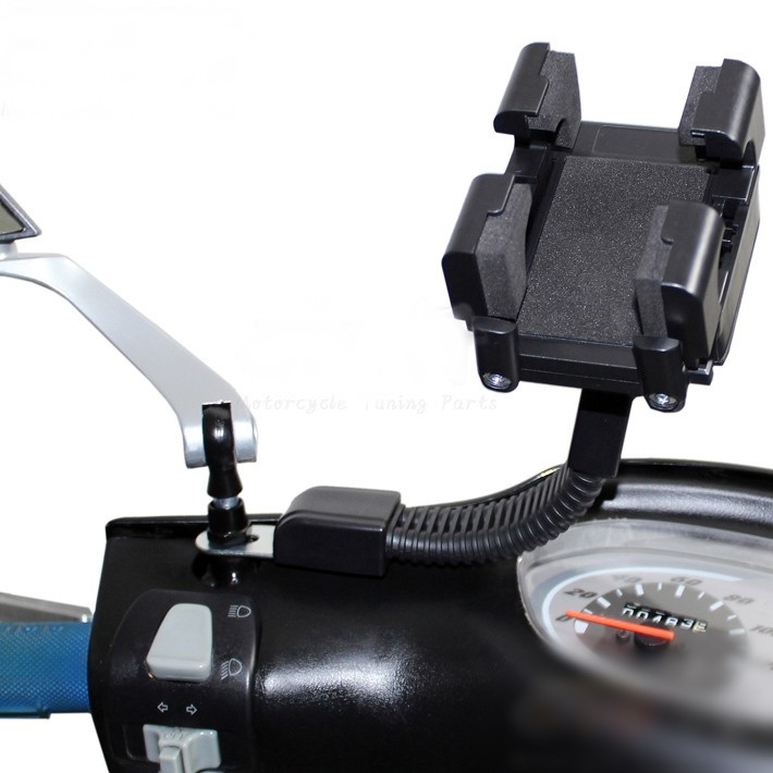 Giới thiệu sản phẩm Giá đỡ điện thoại cho xe máyLà phụ kiện giá đỡ gắn vào chân kính chiếu hậu (lỗ 10mm) cho hầu hết chủng loại mô tô, xe máy hiện nay trên thị trường Việt Nam.