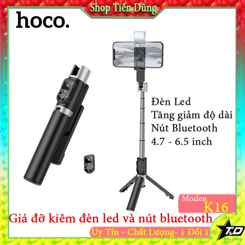 Giá Đỡ Điện Thoại Hoco K16 hay gậy tripod 4 in 1 gồm đèn led , nút bluetooth , tăng giảm chiều cao , gậy Selfie tự sướng.+ Đặc Điểm Giá Đỡ Điện Thoại Kiêm Gậy :
