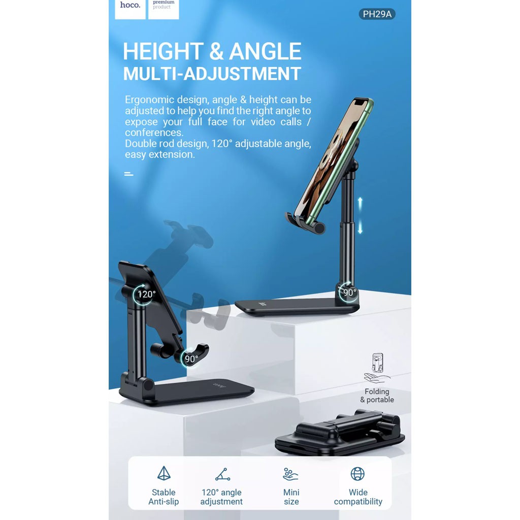Giới thiệu Giá đỡ điện thoại Hoco PH29A chỉnh được góc độ, cao thấp, gấp nhỏ bỏ túi, đỡ được nhiều máy kích thước lớn đến 13icnh