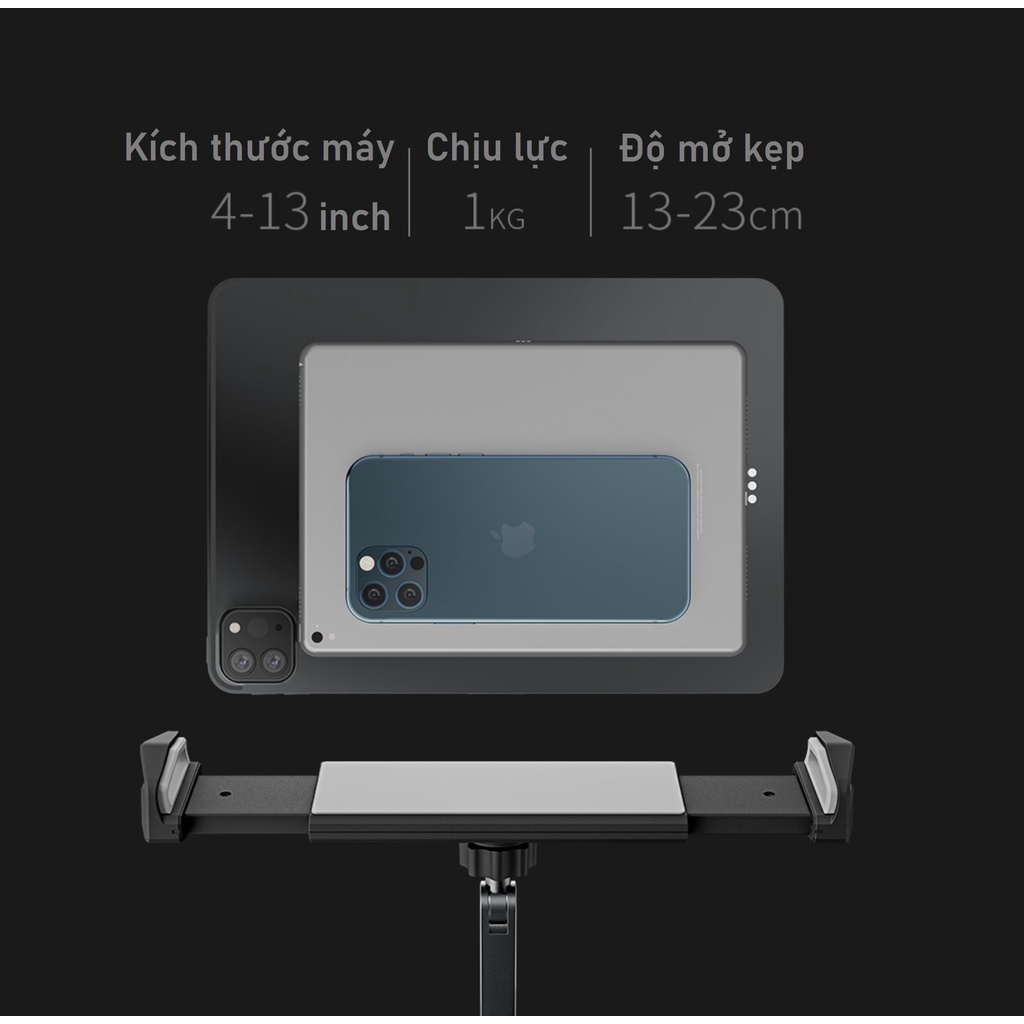 Tương thích máy từ 4 ~ 12.9 inch. Nếu sử dụng ốp, khách hàng vui lòng kiêm tra trọng lượng và kích thước máy phù hợp với độ rộng của kẹp: