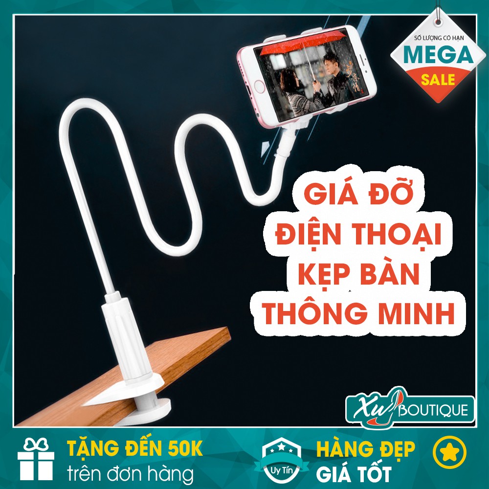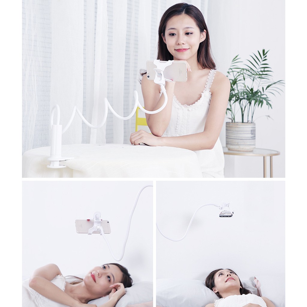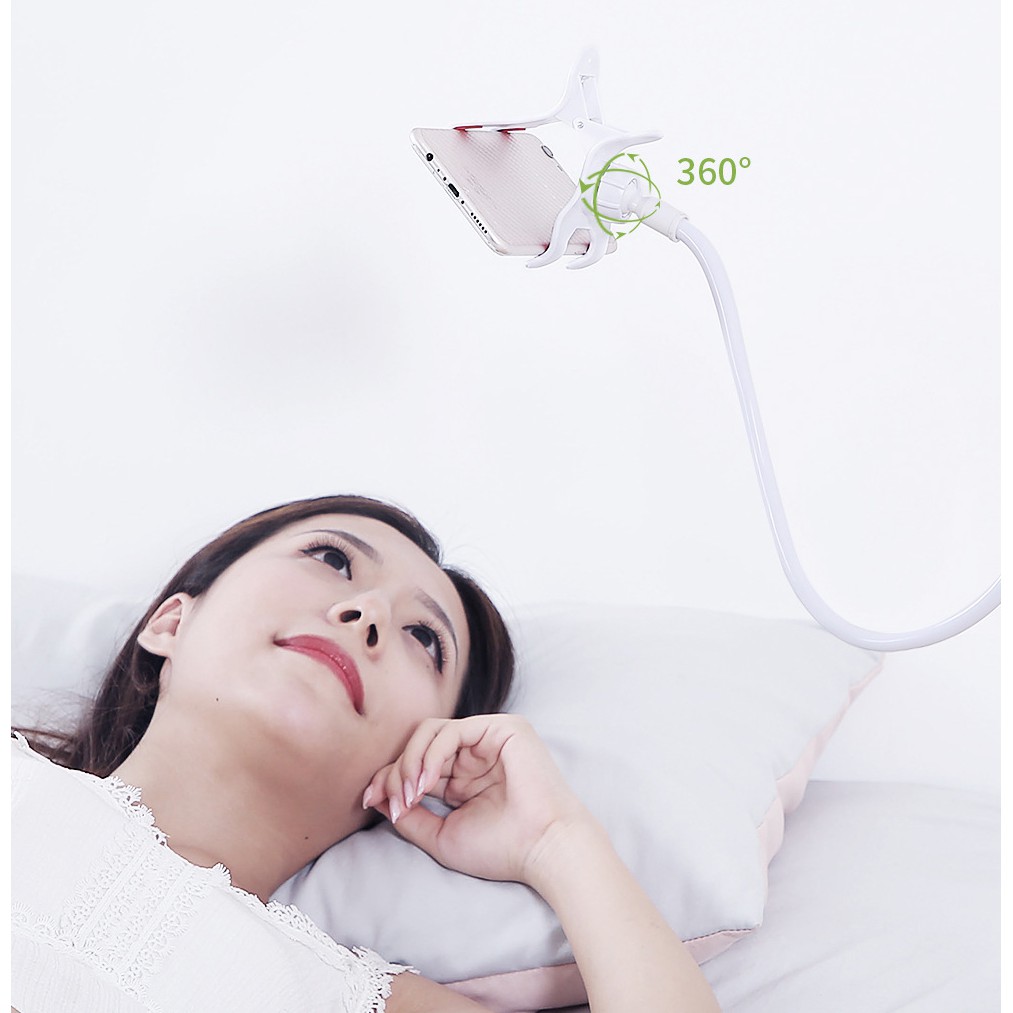 -Bộ gồm 2 phần: Phần kẹp giữ điện thoại + phần thân uốn chân kẹp vào thành giường hoặc thành bàn.