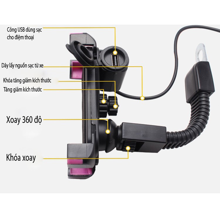 Mô tả sản phẩm: Giá đỡ điện thoại kiêm cổng sạc USB gắn chân gương xe máyKhi đi du lịch bằng xe máy, đi phượt, các bạn luôn muốn lưu giữ lại những hình ảnh của chuyến đi đó 1 cách dễ dàng nhất, bạn muốn trải nghiệm những cung đường mới nhưng thật bất tiện nếu đôi lúc lại phải dừng xe để xem bản đồ trên điện thoại.