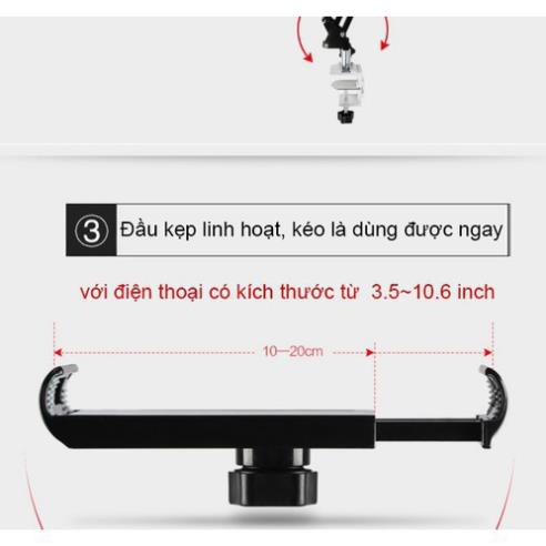 - Phần đầu: có thể kẹp vật có độ dày 110-175mm (điện thoại kẹp ngang, ipad kẹp đứng). có thể điều chỉnh 360 độ (xem thêm ảnh mô tả sản phẩm)