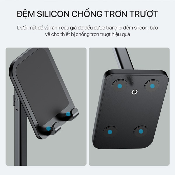 Giá đỡ được làm bằng nhựa ABS chất lượng cao, kết hợp cùng miếng đệm được bọc bằng silicon giúp bảo vệ thiết bị